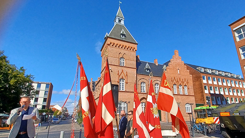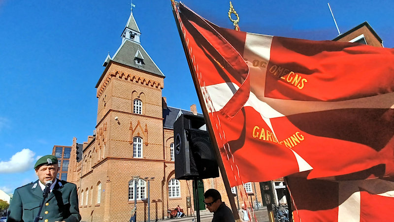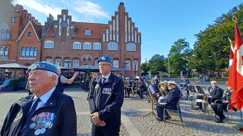 Som en festlig begyndelse på flagdagen anden del på torvet marcherede veteraner fra de forskellige veteranforeninger med faner ind på torvet med Syd- og Sønderjyllands Politiorskester i spidsen ind på torvet. Også politibetjente, der har været udsendt er veteraner, ligesom folk fra Beredsskabsstyrelsen, Udenrigsministeriets UFD og andre udsendt af staten til verdens brændpunkter. Så også disse er velkomne i vore café! |