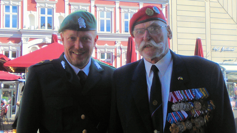 Formanden fik også en snak med oberst (P) Claus Møller, som senere havde æren af at overrække medaljer til veteraners børn samt slå det første søm i vores nye fane, I baggrunden se KFUMs Soldaterhjem, som også var tilstede. KFUMs Soldaterhjem er ofte med forsvaret ude på missioner. |